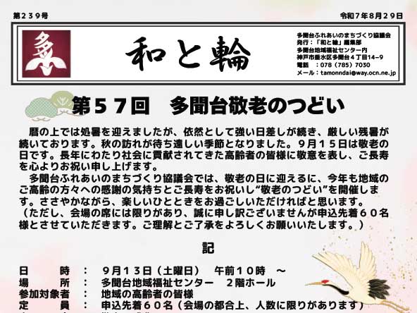 「和と輪」239号(多聞台ふれあいまちづくり協議会ニュースレター)多聞台敬老のつどいのお知らせ など